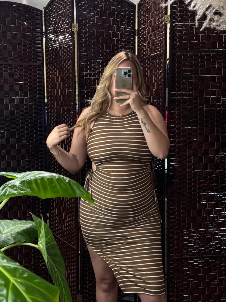 Cocoa/Cream Crew Neck Stripped MIDI Dress With Side Cut Outs
